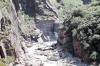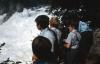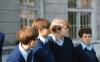 4 boys wearing blue sweaters and collared shirts standing outside of a stone building