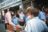 Boys wearing button down shirts browsing books on a city street in Switzerland
