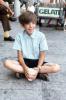 Boy with brown hair sitting on a sidewalk