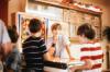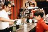 Boy with dark hair and glasses being served a beverage at a cafe; Labeled "Europe 1973"