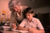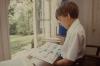 Boy with brown hair wearing a white dress shirt reading a book by a window