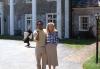 Boy with dark hair standing with girl with blonde hair in front of Albemarle mansion