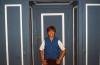 Boy with brown hair standing in room with blue painted walls