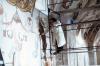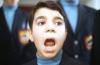 Boys wearing coats and striped scarves boarding a yellow Columbus Boychoir bus