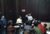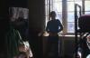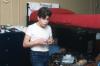 Boys gathered around a drum set in wood paneled room in Albemarle mansion