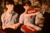 Boys wearing blue turtlenecks and gray suits singing on stage