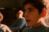 Dark haired boy wearing light blue turtleneck in a classroom