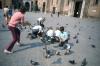 Boys wearing light blue button up shirts feeding pigeons