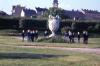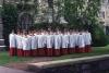 Boys wearing vestments outside of a stone building