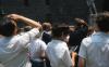 Boys wearing light blue button up shirts at an outdoor market