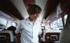 Boy with brown hair wearing a white button down shirt standing in the aisle of a bus