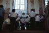 Boys wearing white button up shirts inside a building with marble features
