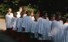 Boys in vestments lined up and walking outside