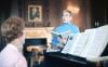 Ron Miller wearing light blue turtleneck singing while woman with brown hair plays piano