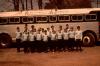 Boys wearing light blue turtlenecks standing beside the Columbus Boychoir bus