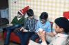 3 boys receiving their weekly allowances from woman with white hair and glasses