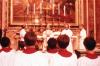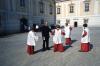 Boys wearing vestments and a clergy member outside in courtyard of Zwettl Abbey monastery in Zwettl, Austria