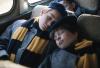 2 boys wearing striped scarves and tweed coats asleep on a bus