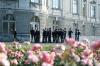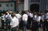 Group of boys in white button up shirts outside of a building