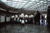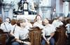 Group of boys in white button up shirts looking up at the ceiling of a church