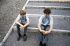 2 boys (one with glasses) wearing blue button down shirts sitting on stone steps