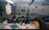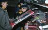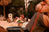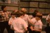 Group of boys in white button up shirts and man in plaid shirt outside stone building