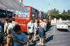 Group of boys with red tour bus in background