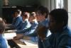 Boys wearing light blue turtlenecks sitting at desks in a classroom