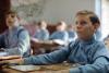 Boys wearing light blue turtlenecks sitting at desks in a classroom