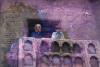 Boy wearing a blue dress shirt on a balcony with a clergy member