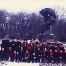 Posing in front of the Chopin Memorial in Warsaw, Poland