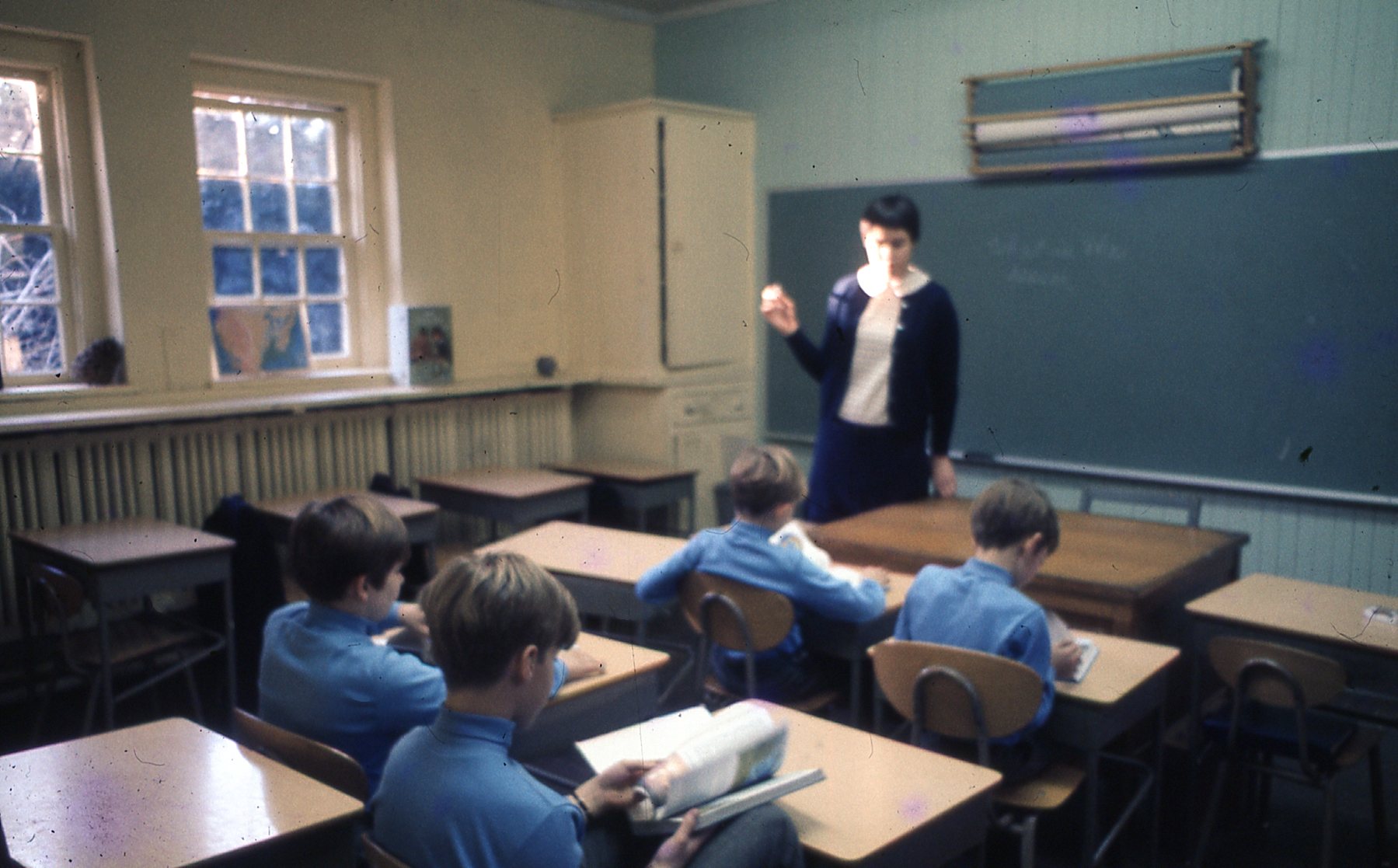Boys wearing light blue turtlenecks sitting at desks in a classroom; woman with dark hair teaching