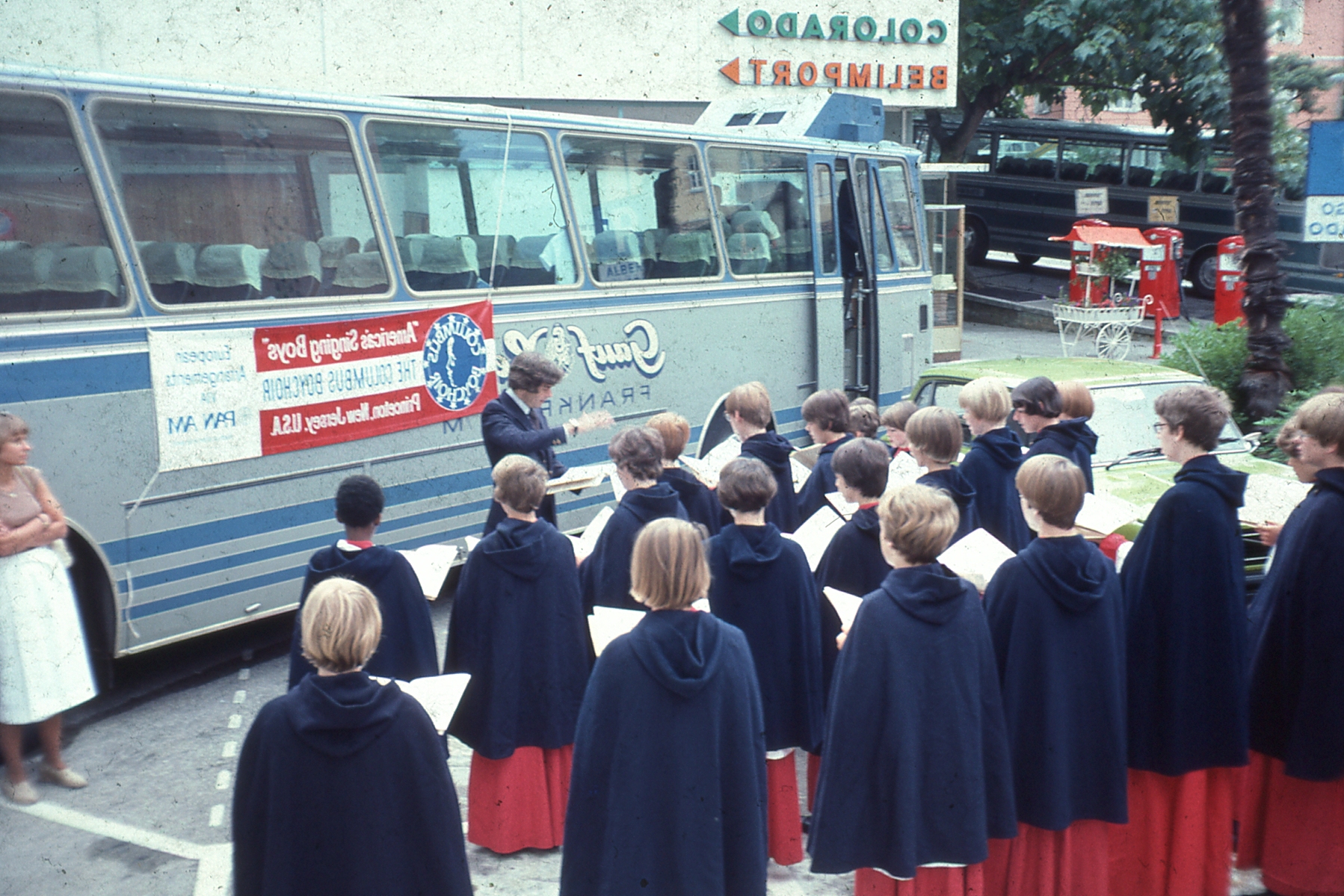 Boys wearing vestments and dark hooded cloaks standing outside of bus; sign printed "Albergo Colorado