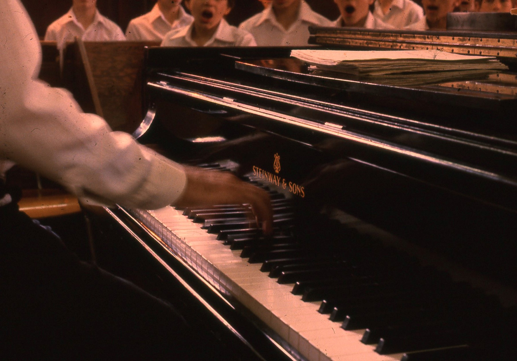 Boys wearing white button down shirts rehearsing in the Loggia at Albemarle mansion