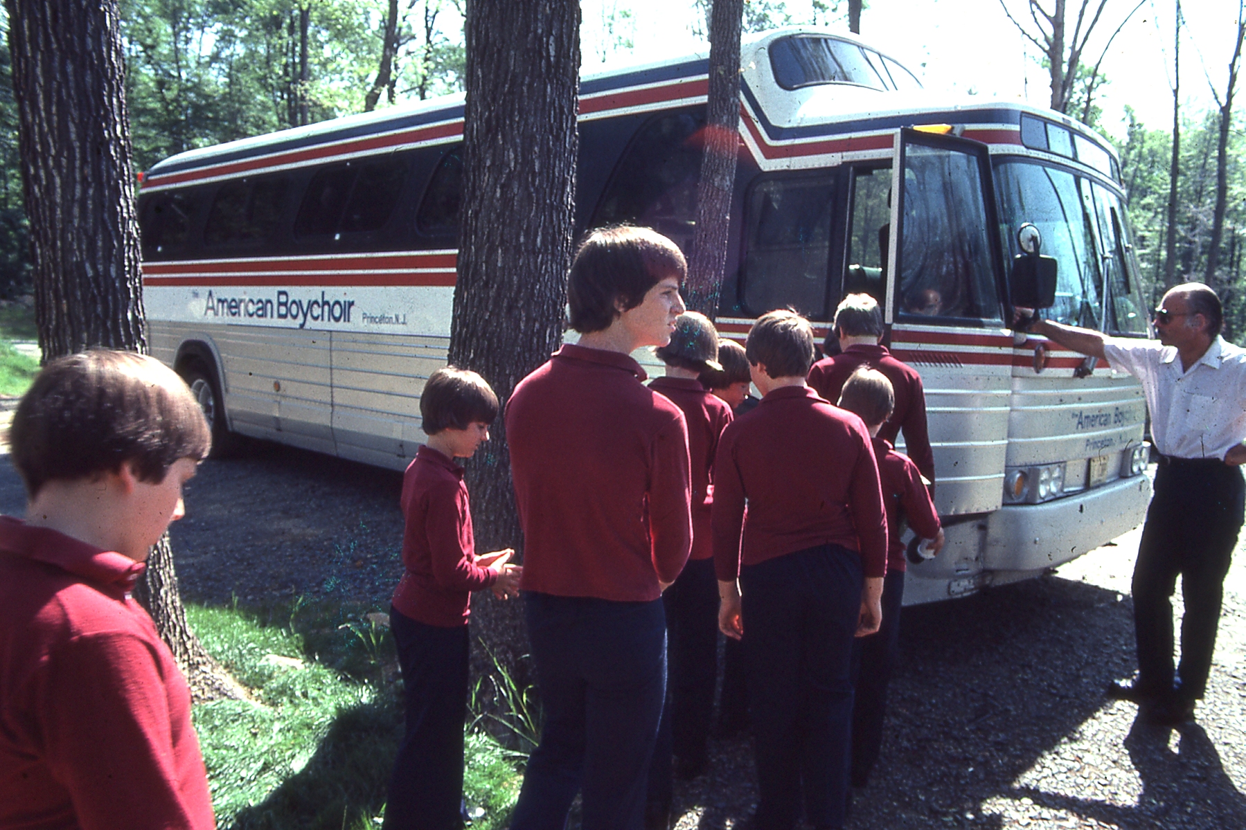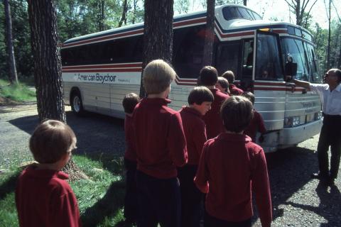 Boys wearing burgundy shirts boarding the Boychoir bus