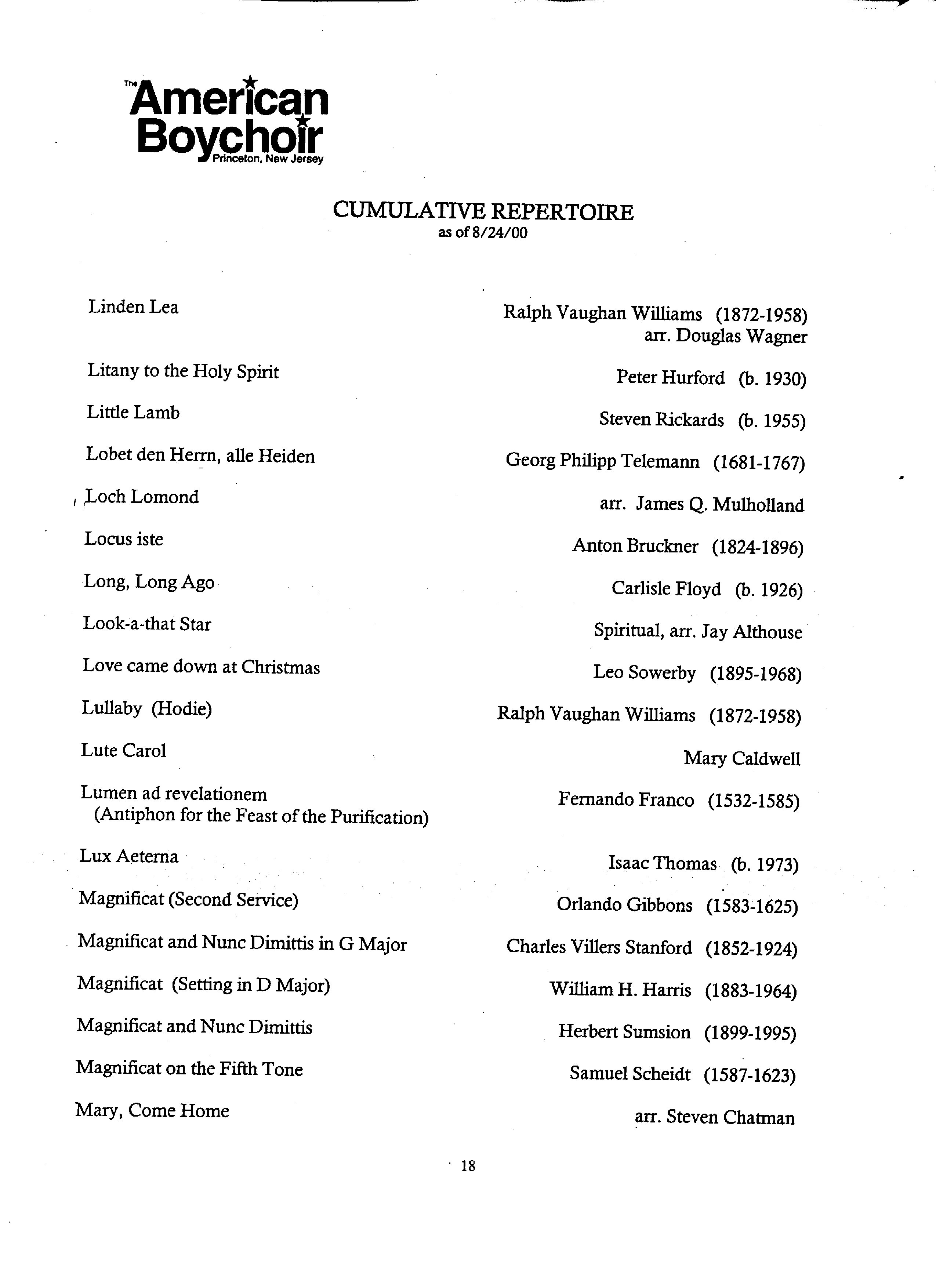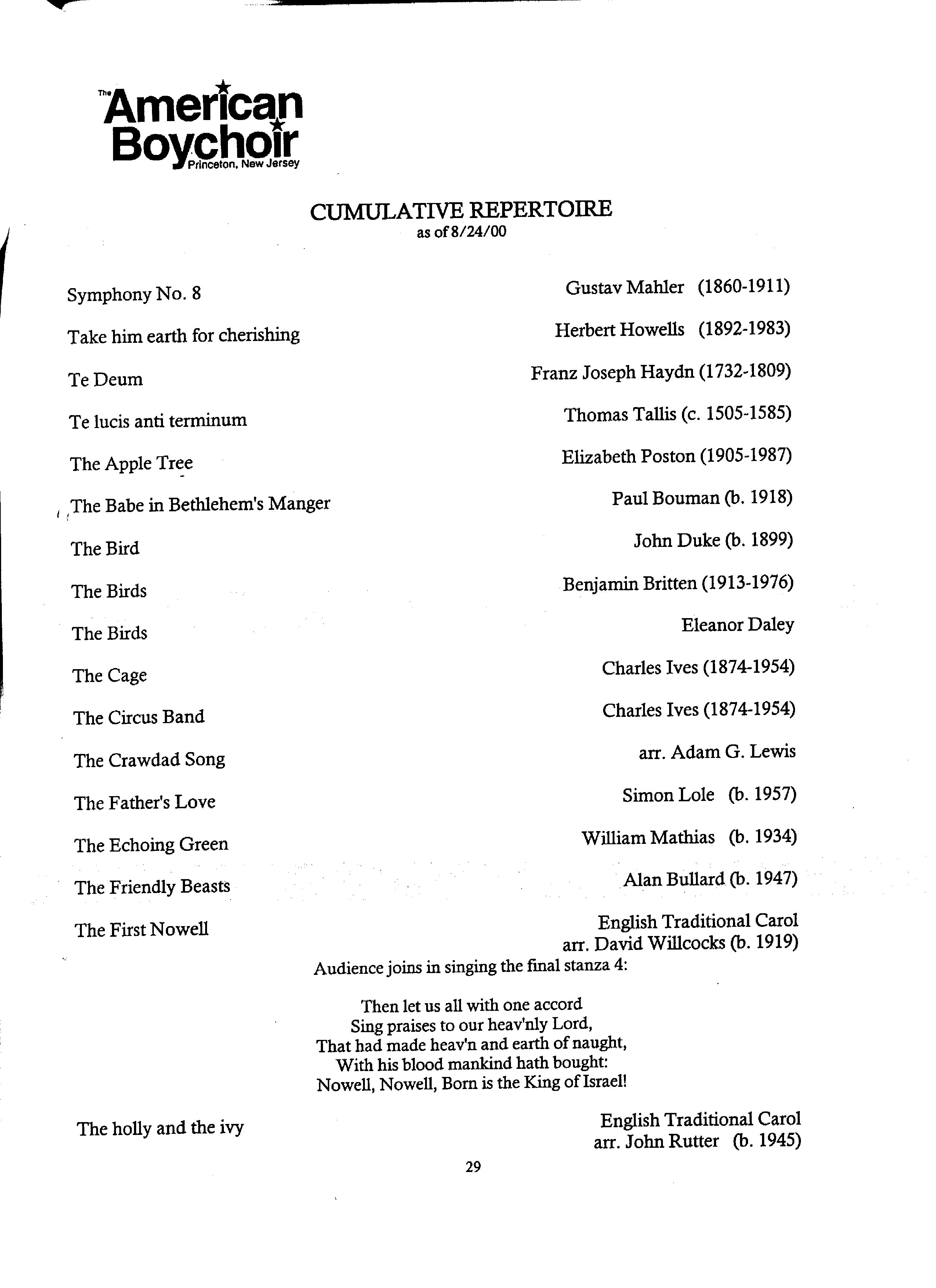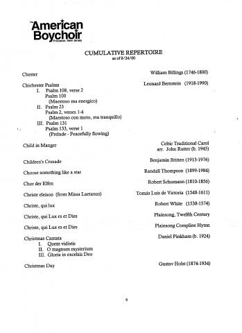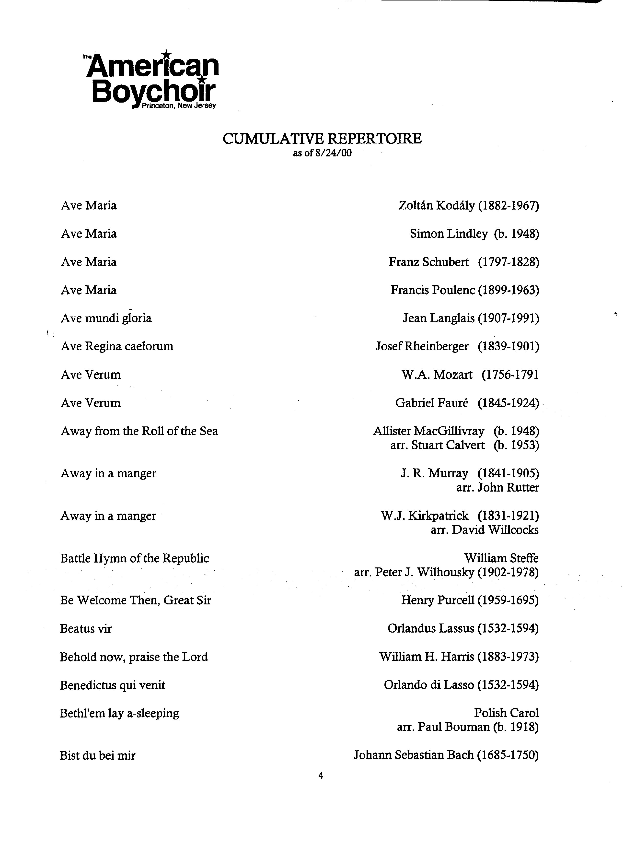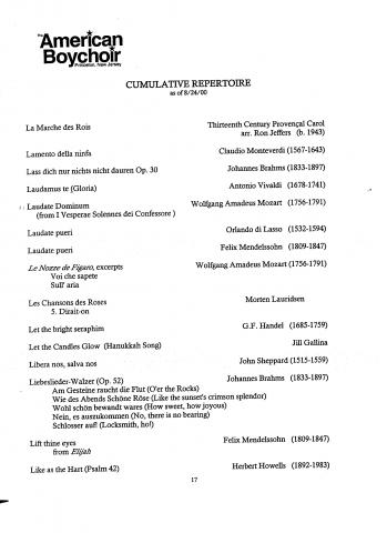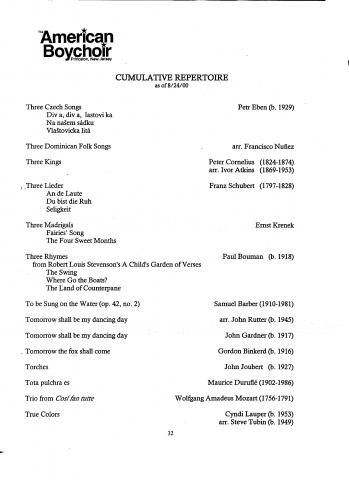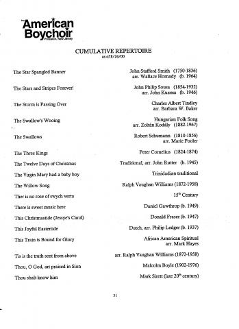 The American Boychoir Culmulative Repertoire as of 8/24/00