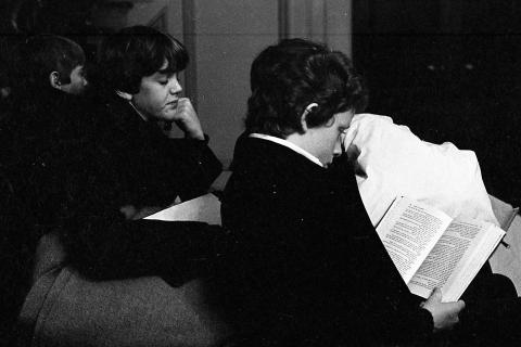 Boys wearing coats inside Albemarle mansion as they prepare to go on a trip