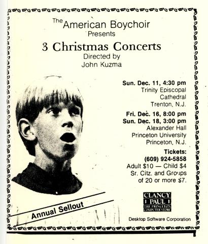 Entry Title Ad for ABS Christmas Concerts Archive Type Advertisements Performance Photo Photographs Relevant Parties John Kuzma, Director Address NJ United States Archive Box Number ABS-011 Add new comment Your name Email Subject Comment About text formats Restricted HTML Allowed HTML tags: <a href hreflang> <em> <strong> <cite> <blockquote cite> <code> <ul type> <ol start type> <li> <dl> <dt> <dd> <h2 id> <h3 id> <h4 id> <h5 id> <h6 id> Lines and paragraphs break automatically. Web page addresses and email addresses turn into links automatically. CAPTCHA