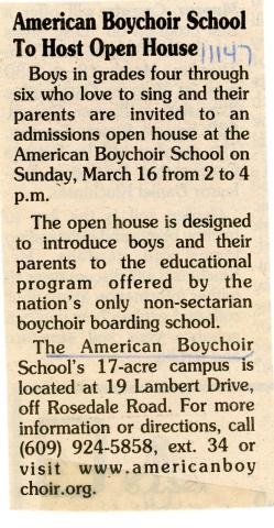 Entry Title American Boychoir to Host Open House Date Wed, 03/12/2003 - 00:00 Archive Type Article Photographs Address Town Topics Princeton, NJ United States Archive Box Number ABS-011 Add new comment Your name Email Subject Comment About text formats Restricted HTML Allowed HTML tags: <a href hreflang> <em> <strong> <cite> <blockquote cite> <code> <ul type> <ol start type> <li> <dl> <dt> <dd> <h2 id> <h3 id> <h4 id> <h5 id> <h6 id> Lines and paragraphs break automatically. Web page addresses and email addresses turn into links automatically. CAPTCHA