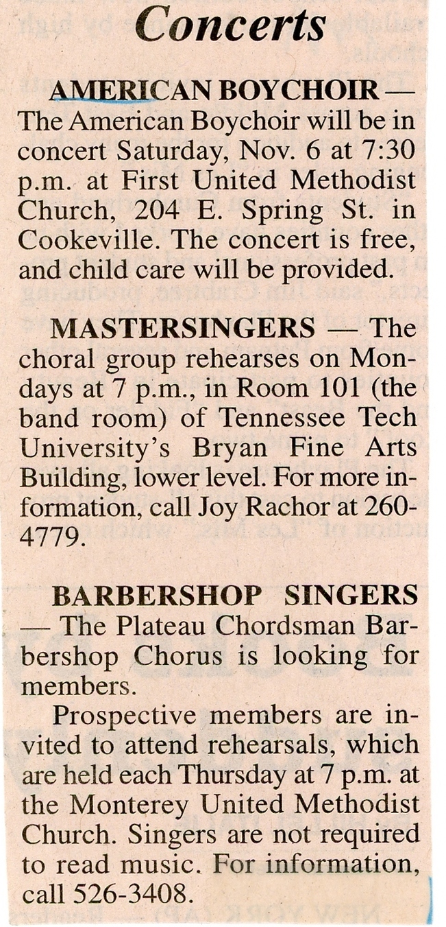Entry Title Concert announcement Date Sun, 10/31/2004 - 00:00 Archive Type Advertisements Performance Photographs Address Herald-Citizen Cookeville, TN United States Archive Box Number ABS-011 Add new comment Your name Email Subject Comment About text formats Restricted HTML Allowed HTML tags: <a href hreflang> <em> <strong> <cite> <blockquote cite> <code> <ul type> <ol start type> <li> <dl> <dt> <dd> <h2 id> <h3 id> <h4 id> <h5 id> <h6 id> Lines and paragraphs break automatically. Web page addresses and email addresses turn into links automatically. CAPTCHA
