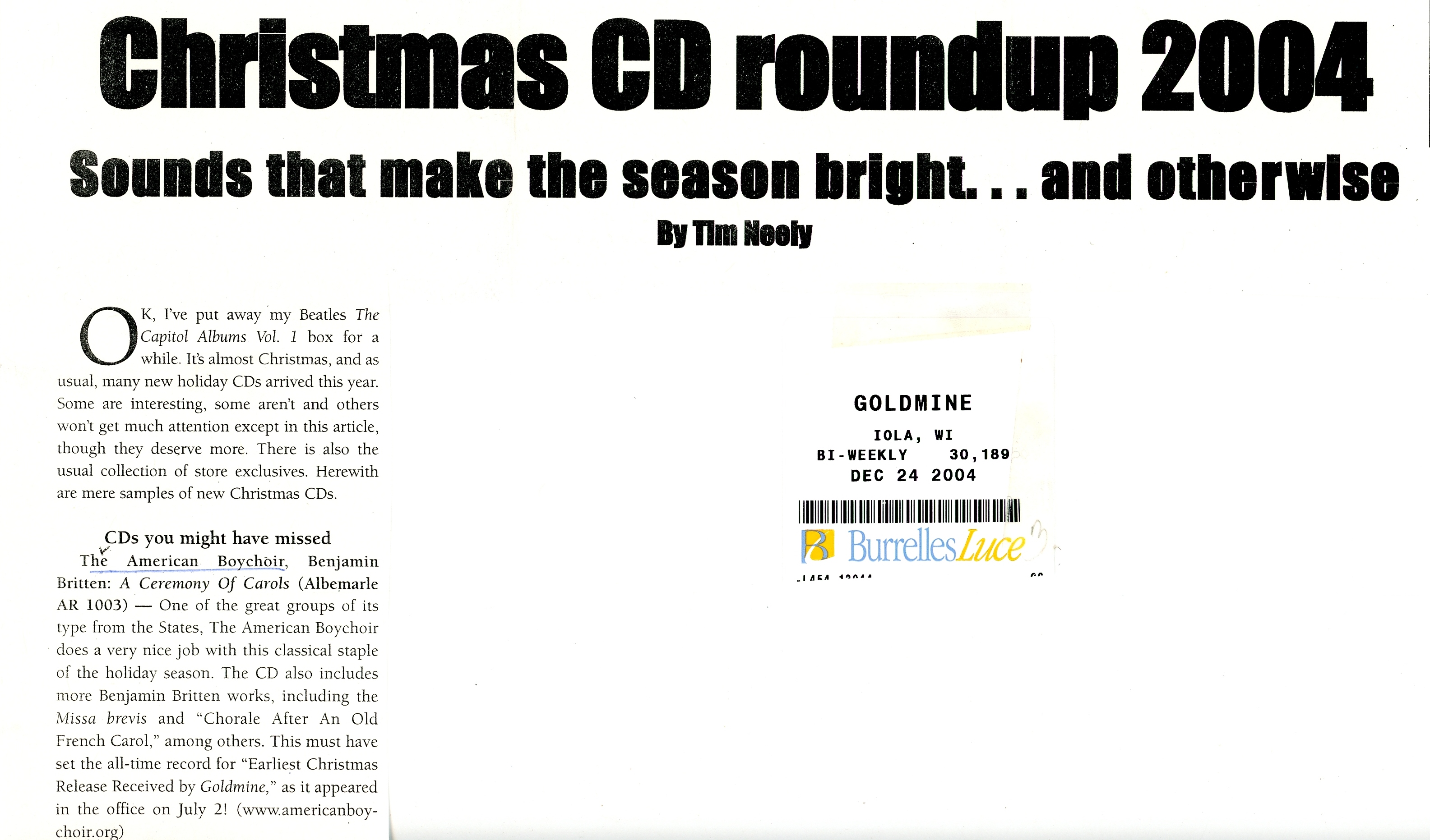 Entry Title Christmas CD roundup 2004 Date Fri, 12/24/2004 - 00:00 Archive Type Article Recording Photographs Address Goldmine Iola, WI United States Archive Box Number ABS-011 Add new comment Your name Email Subject Comment About text formats Restricted HTML Allowed HTML tags: <a href hreflang> <em> <strong> <cite> <blockquote cite> <code> <ul type> <ol start type> <li> <dl> <dt> <dd> <h2 id> <h3 id> <h4 id> <h5 id> <h6 id> Lines and paragraphs break automatically. Web page addresses and email addresses turn into links automatically. CAPTCHA