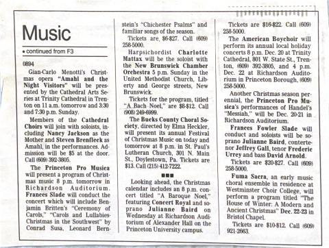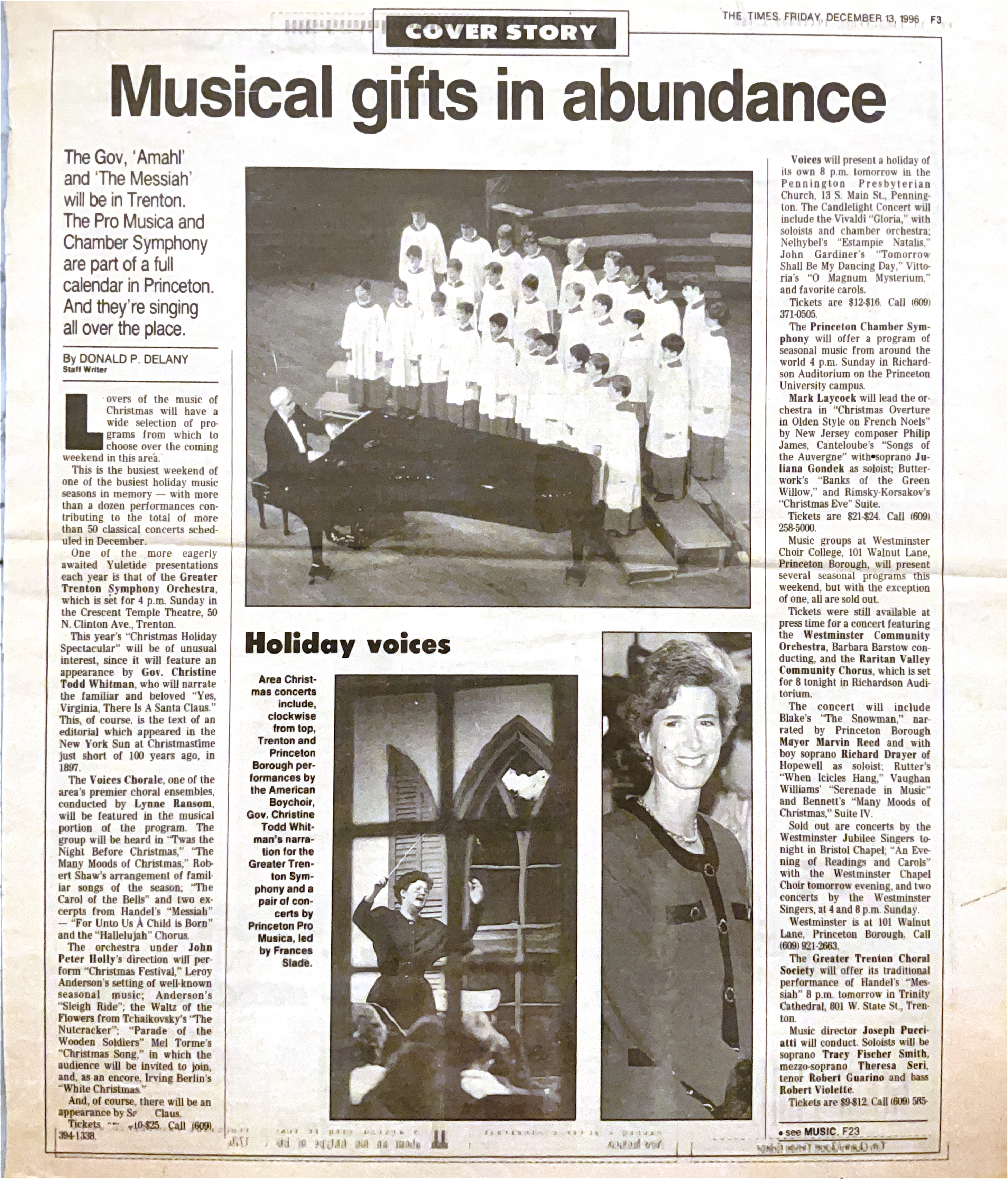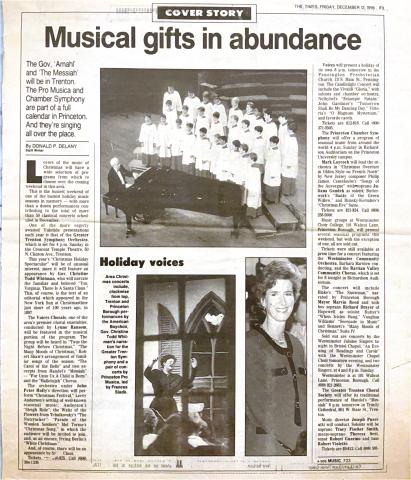 Entry Title Musical gifts in abundance Date Fri, 12/13/1996 - 00:00 Archive Type Article Performance Photo Photographs Address The Times Trenton, NJ United States Archive Box Number ABS-011 Add new comment Your name Email Subject Comment About text formats Restricted HTML Allowed HTML tags: <a href hreflang> <em> <strong> <cite> <blockquote cite> <code> <ul type> <ol start type> <li> <dl> <dt> <dd> <h2 id> <h3 id> <h4 id> <h5 id> <h6 id> Lines and paragraphs break automatically. Web page addresses and email addresses turn into links automatically. CAPTCHA