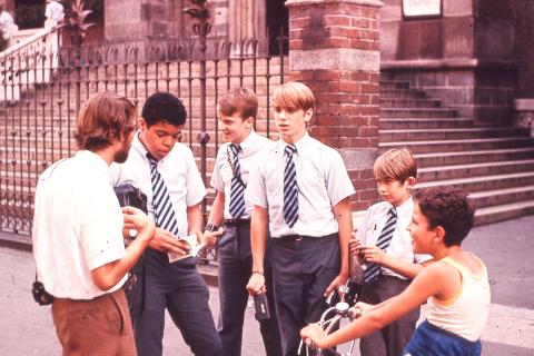 Boys wearing dress shirts and striped ties sightseeing in a city