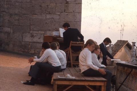 Boys sitting on the balcony of the Spoleto Cathedral in Spoleto, Italy