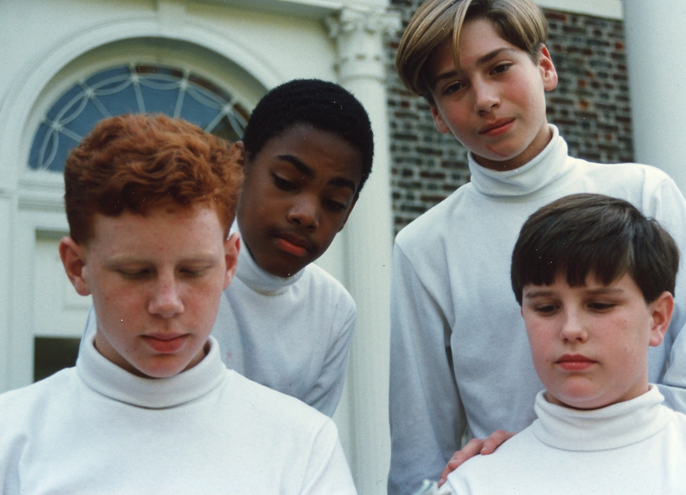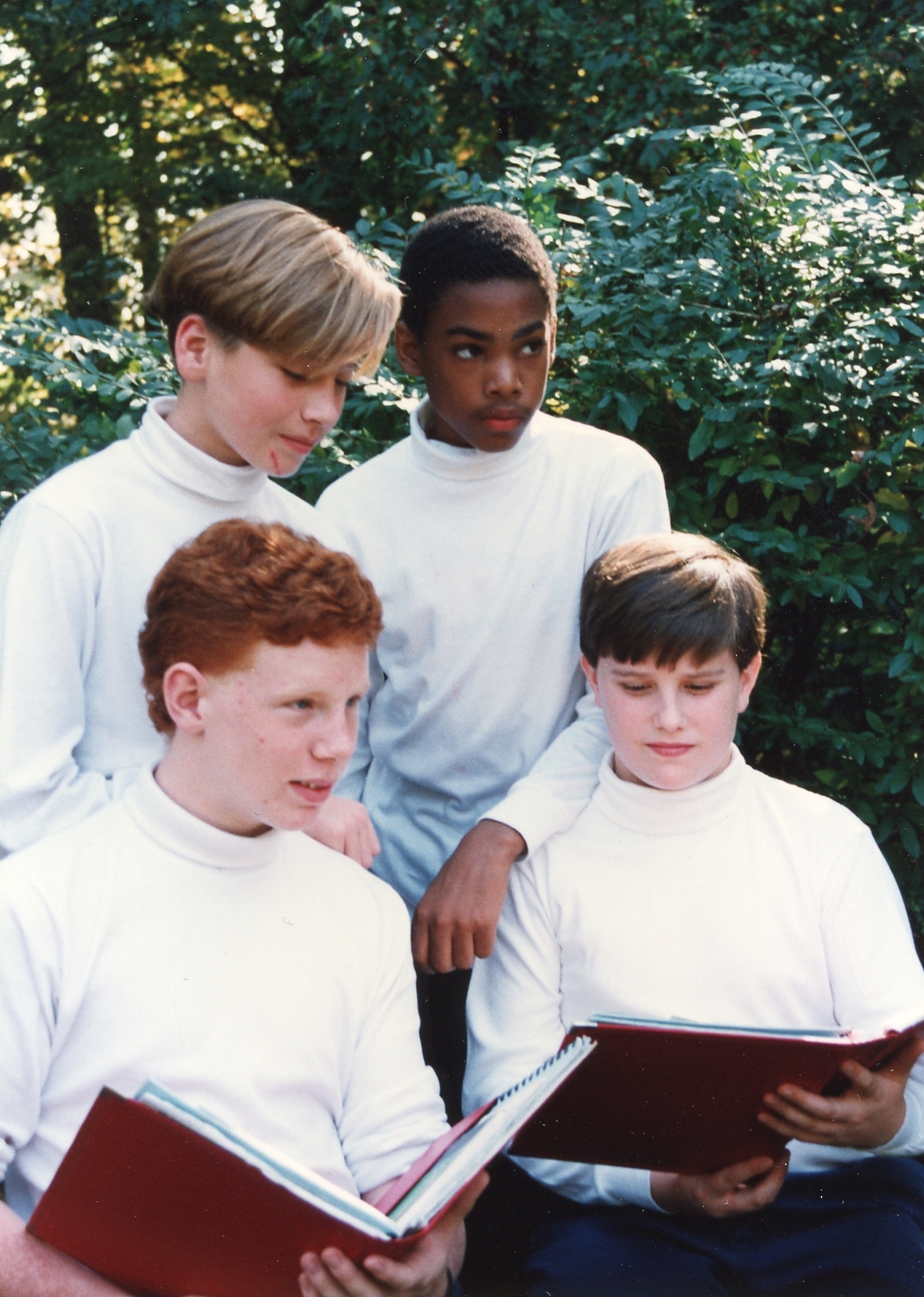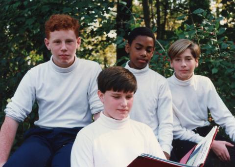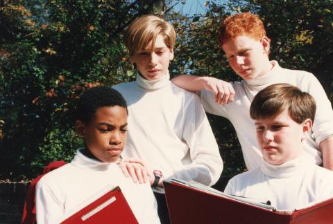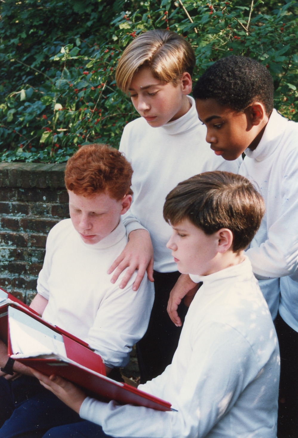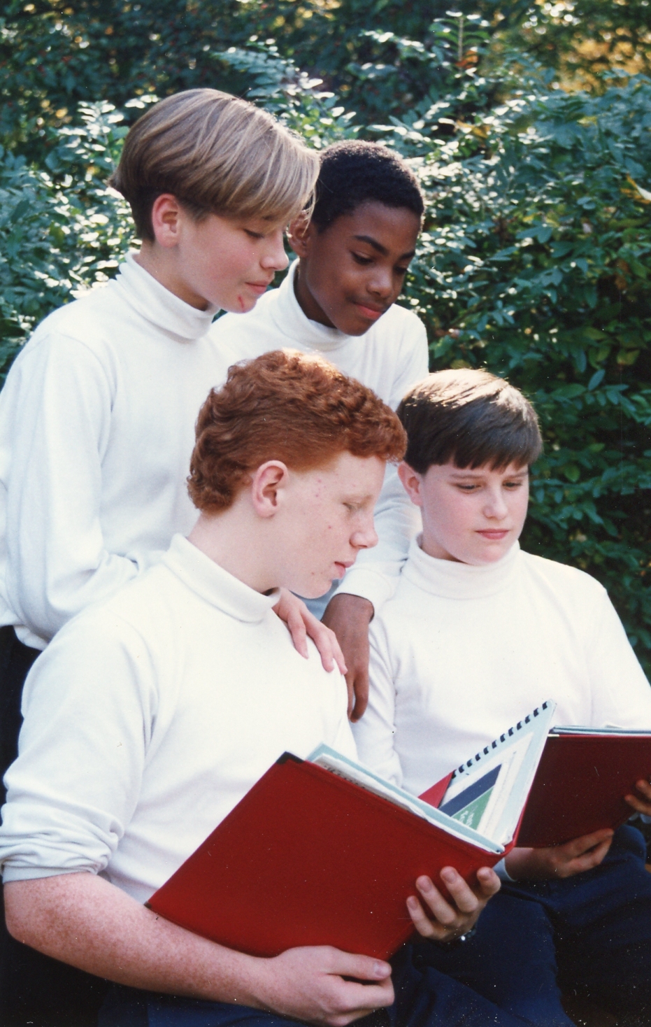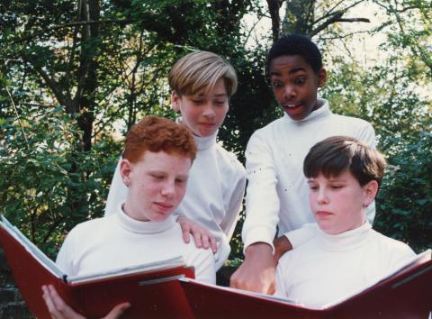 Boys, wearing white turtlenecks, looking at books outside on Albemarle Estate