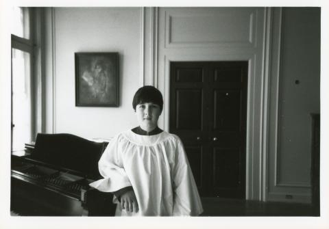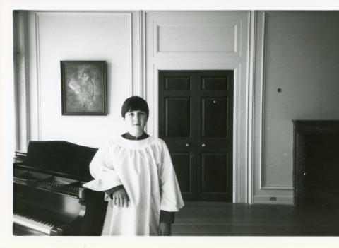 Boy with dark hair, wearing a choir robe, standing beside a piano inside Albemarle mansion