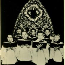 Early photo of boys wearing white choir surplices singing in front of stained glass window