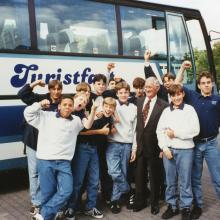 Boys, wearing blue turtlenecks, standing outside of the J F Kennedy Center for the Performing Arts