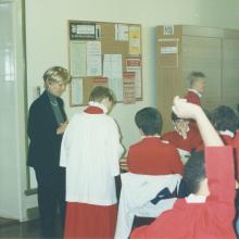 Boys, wearing vestments, backstage along with Alison Hankinson