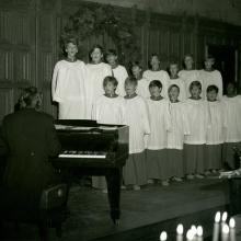 Boys, wearing street clothes, rehearsing inside Albemarle mansion